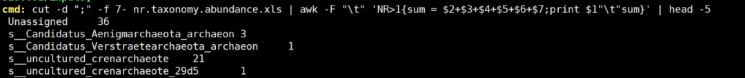 cut -d “;” -f 7- nr.taxonomy.abundance.xls | awk -F “\t” ‘NR>1{sum = $2+$3+$4+$5+$6+$7;print $1″\t”sum}’ | head -5 #計(jì)算各個(gè)種在所有樣本種的豐度之和,展示前5行。