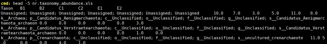 grep -v ‘^Taxon’ nr.taxonomy.abundance.xls | cut -d “;” -f 7- |head -5 #從中篩選種級別的注釋結(jié)果,并展示前5行。