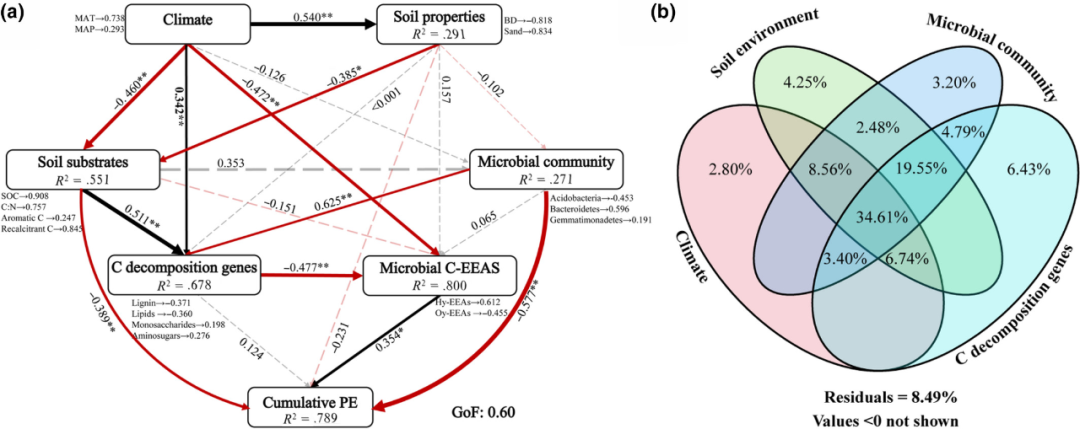 圖1 環(huán)境活力對累積啟動(dòng)效應(yīng) (PE) 的影響 (a) PLS-PM有向圖 (b) VPA分析顯示氣候、土壤環(huán)境、微生物群落和C分解基因?qū)鄯e啟動(dòng)效應(yīng)的相對貢獻(xiàn)