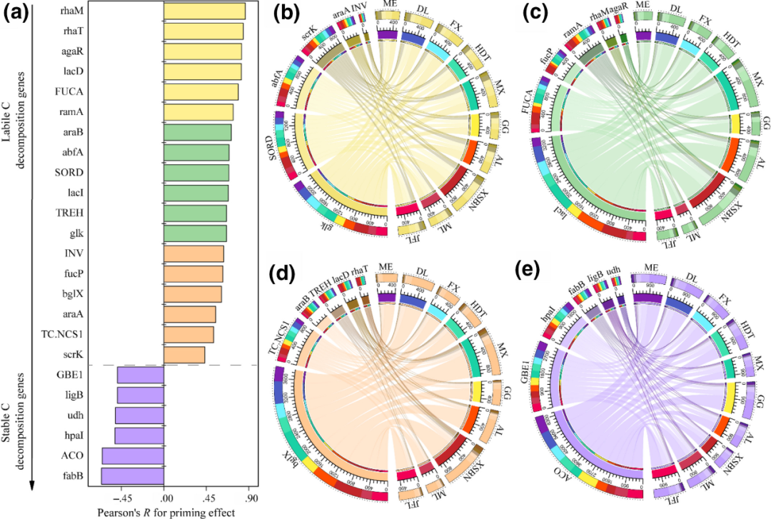 圖3 預(yù)測基因在整個(gè)森林生物群系中的啟動(dòng)效應(yīng) (a) 所選關(guān)鍵基因的變化(由與啟動(dòng)效應(yīng)的顯著相關(guān)性表示:p?<0 .05),(b-d) 所選基因在森林生物群落中不穩(wěn)定C分解的分布 (e) 用于在森林生物群系中穩(wěn)定C分解的選定基因的分布