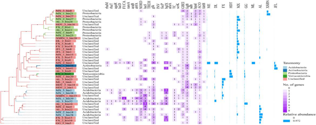 對于分類學(xué),42個(gè)MAG在門水平上代表了變形菌門(七個(gè))、酸桿菌門(六個(gè))、放線菌門(一個(gè))和疣微菌門(一個(gè))中的多種細(xì)菌門。在變形菌門中,Alphaproteobacteria綱(四個(gè))和Rhizobiales目(兩個(gè))是最豐富的。在酸桿菌中,Solibacteres綱(四個(gè))和?Candidatus Solibacter usitatus?種(四個(gè))代表更多。此外,基于系統(tǒng)發(fā)育關(guān)系,來自16S rRNA 系統(tǒng)型的五個(gè)未分類bin與相似的分類bin聚類。