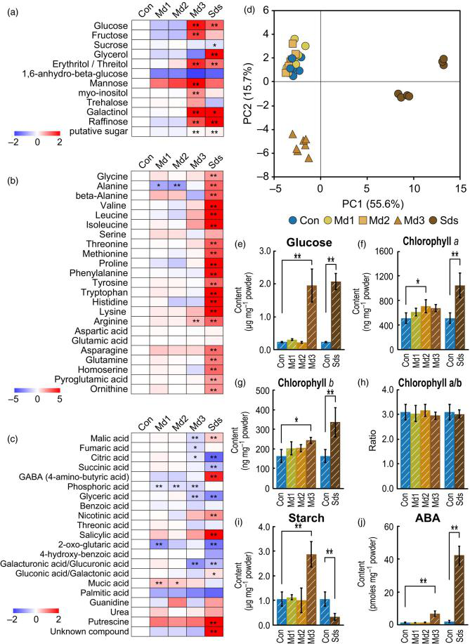 研究結(jié)果:為了分析植物對不同干旱脅迫響應(yīng)的分子機(jī)制,作者開發(fā)了一種基于土壤基質(zhì)電位(SMP)的灌溉系統(tǒng),可√準(zhǔn)控制土壤水分。使用該系統(tǒng),水稻幼苗在三種不同的干旱水平下生長,分別表示為?Md1、Md2?和?Md3,SMP?值分別設(shè)置為?-9.8、-31.0?和?-309.9?kPa。Md1?處理沒有明顯的表型變化,?Md2?處理導(dǎo)致氣孔關(guān)閉和枝條生長遲緩?(SGR)。Md3?處理出現(xiàn)明顯的SGR,但是不抑制光合作用。更嚴(yán)重的干旱?(Sds)?處理,在這種情況下終止灌溉,導(dǎo)致葉片枯萎和光合作用受到抑制。代謝組分析發(fā)現(xiàn)?Md3?和?Sds?下干旱會導(dǎo)致糖類和氨基酸含量的增加。淀粉含量在?Md3?下增加,在?Sds?下減少。轉(zhuǎn)錄組數(shù)據(jù)顯示,上述代謝物的含量是受到相關(guān)基因在轉(zhuǎn)錄水平上調(diào)控的。為了進(jìn)一步了解觀察到?SGR,在特定組織中進(jìn)行了轉(zhuǎn)錄組和激素分析。結(jié)果顯示在?Md2、Md3?和?Sds?處理的芽基中吲哚-3-乙酸?(IAA)?和細(xì)胞分裂素水平的特異性降低,但是激素代謝相關(guān)基因的表達(dá)水平并沒有變化。這些觀察結(jié)果表明,干旱可能是影響細(xì)胞分裂素和生長素在特定組織中的分配和降解。