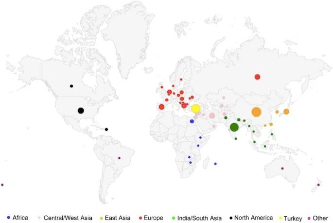 1234份黃瓜種質(zhì)資源地理分布