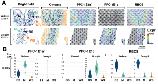 1. 研究人員通過激光顯微技術(shù)對(duì)不同環(huán)境(水分充足及干旱環(huán)境,白天及夜間)葉片進(jìn)行切割區(qū)分,獲得葉肉,葉鞘及水分貯藏細(xì)胞,進(jìn)行傳統(tǒng)的轉(zhuǎn)錄組分析,并結(jié)合空間轉(zhuǎn)錄組測(cè)序及葉片的組織區(qū)分,分析了C4及CAM相關(guān)的差異表達(dá)基因,并建立了流量平衡模型,預(yù)測(cè)了干旱條件下c4 +CAM系統(tǒng)的完整性。