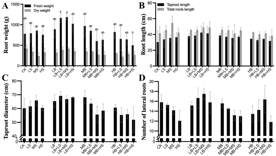 在收獲時(shí),還確定了地塊產(chǎn)量的變化(圖2)。與兩個(gè)明顯的倒V形趨勢(shì)的生長(zhǎng)結(jié)果一致,LB + LS和LB + MS處理下的R. palmatum?L.根的鮮重得到了最顯著的改善(圖2A)。我們進(jìn)一步分析了主根和側(cè)根的變化(圖2B-D),發(fā)現(xiàn)在LB+MS下獲得最大的根長(zhǎng)和側(cè)根數(shù),而在LB+LS下獲得最大的主根直徑,這意味著 LB + MS處理刺激側(cè)根的數(shù)量和長(zhǎng)度,而LB + LS促進(jìn)主根厚度以提高R. palmatum?L.的根重。