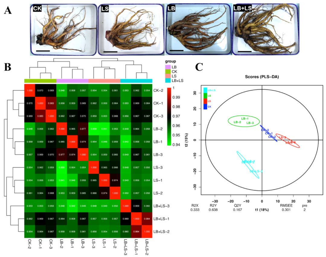 重點(diǎn)放在LB+LS的結(jié)合分組,通過(guò)廣靶代謝組學(xué)探索促進(jìn)植物生長(zhǎng)的潛在機(jī)制(圖3A)。共對(duì)12個(gè)新鮮的根樣品進(jìn)行了表征,鑒定了800種帶注釋的代謝物,主要由38種羧酸及其衍生物、15種有機(jī)氧化合物、14種脂肪?;?11種有機(jī)氮化合物組成。使用 GC-TOF-MS的全局靶向代謝組分析方法進(jìn)行相關(guān)偏最小二乘判別分析 (PLS-DA),如圖所示(圖3B),三個(gè)生物配對(duì)之間的 Spearman相關(guān)系數(shù)均超過(guò)0.94,這表現(xiàn)了實(shí)驗(yàn)的高重現(xiàn)性。然后通過(guò)PLS-DA評(píng)分圖來(lái)評(píng)估這些植物組織樣品之間的差異(圖3C),結(jié)果顯示出了分組之間的明顯分離。此外,對(duì)潛在結(jié)構(gòu)判別分析(OPLS-DA)建模的監(jiān)督正交投影也揭示了這些分組植物組織樣本代謝組比較中的顯著差異。
