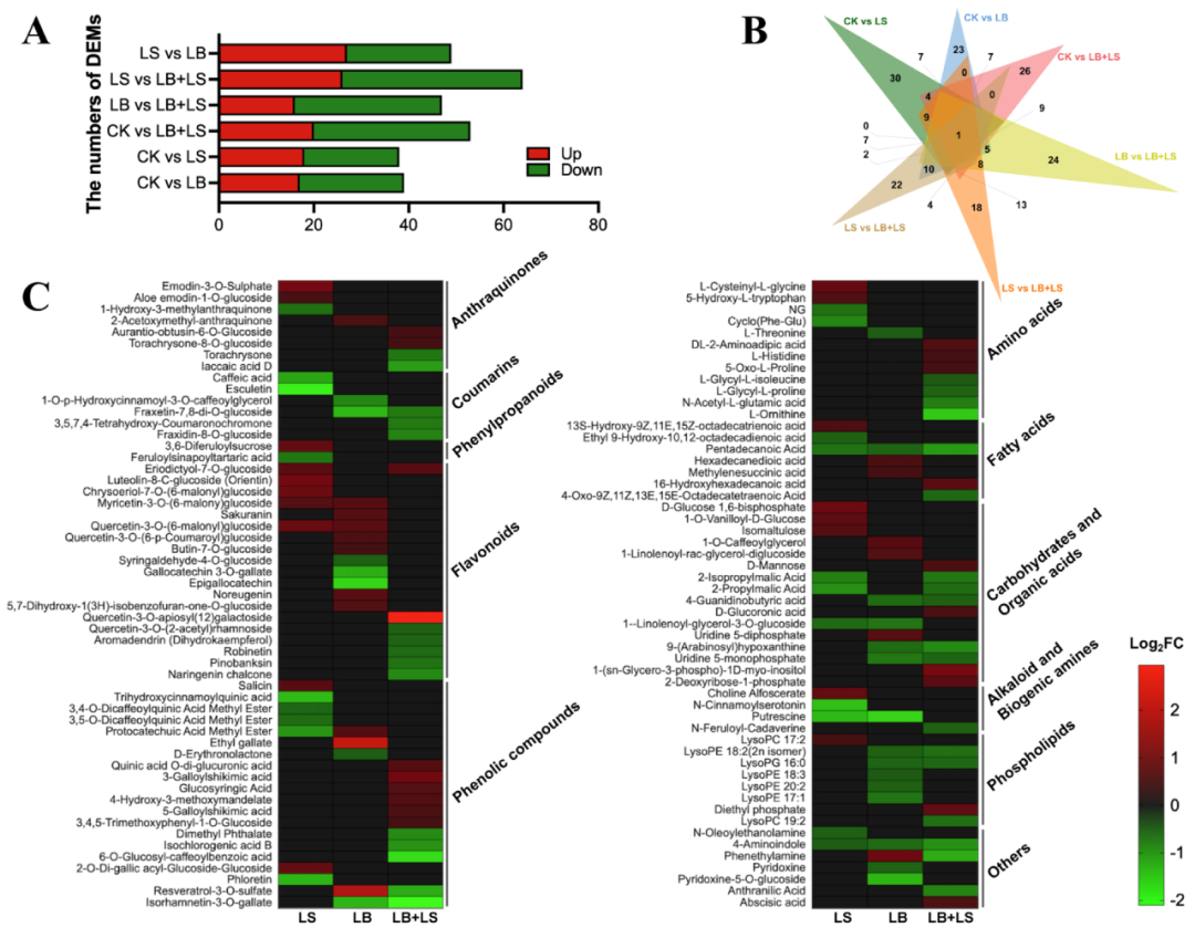 通過(guò)VIP(Variable Importance in Projection ) ≥ 1、倍數(shù)變化 ≥ 1.5 和 p 值 ≤ 0.05 的篩選標(biāo)準(zhǔn),顯著鑒定了 38、39、53、47、64 和 49 種差異表達(dá)代謝物 (DEMs,Differentially Expressed Metabolites )分別在 CK vs.LS、CK vs.LB、CK vs.LB + LS、LB vs.LB + LS、LS vs.LB + LS 和LS vs.LB(圖4A)。
