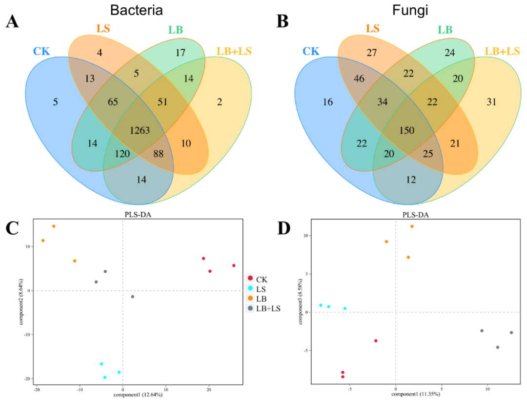 PLS-DA分析顯示,四種處理(CK、LS、LB 和 LB + LS)的樣品在細(xì)菌群落(分別占總變量的 12.64% 和 8.64%)和真菌群落中均分離良好(分別占總變量的 11.35% 和 8.58%)(圖 6C,D)。對(duì)于細(xì)菌,處理后的α多樣性雖然與CK相比差異不顯著,但豐富度指數(shù)(Ace和Chao1)和多樣性指數(shù)(Simpson,Shannon,PD Whole Tree除外)在處理中都減少了,特別是在LS土壤中。然而,CK和LB + LS之間的Simpson Index存在顯著差異(p?= 0.0147)。