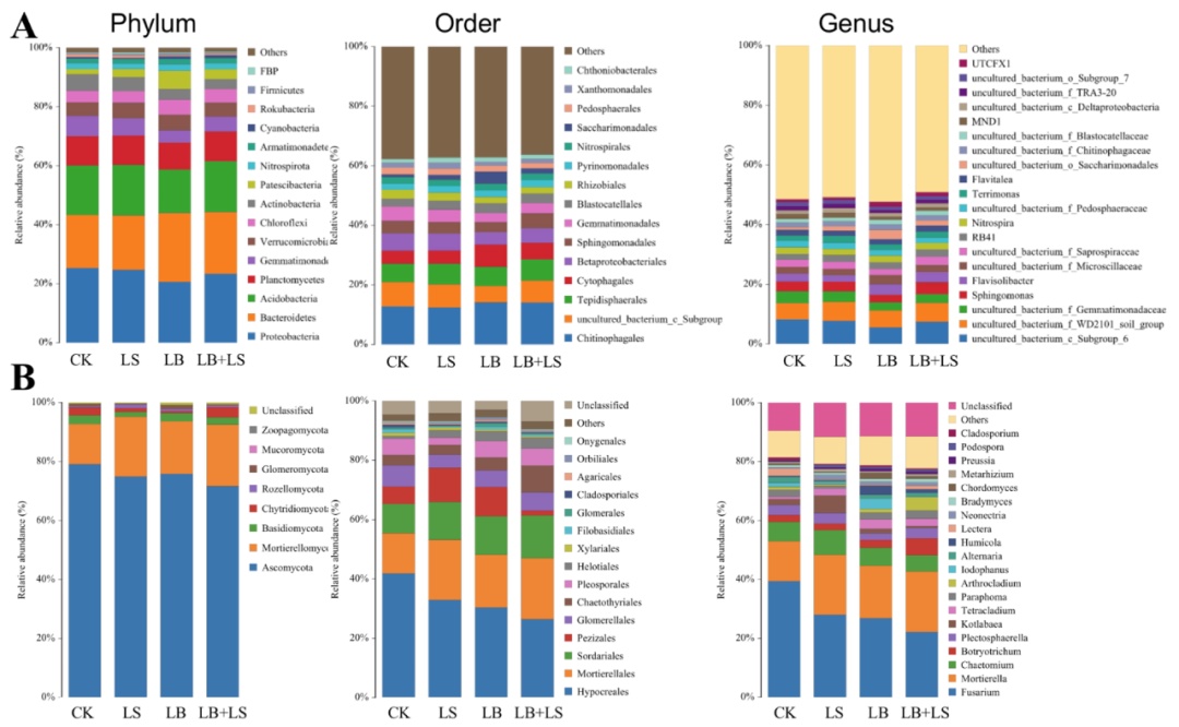 進(jìn)一步分析微生物群落結(jié)構(gòu)表明,16S rRNA基因序列隸屬于31門(mén)257科396屬,而ITS rRNA基因序列隸屬于8門(mén)100科170屬。圖7顯示了在群落組成中發(fā)現(xiàn)的15個(gè)最豐富的門(mén)和目,以及前20個(gè)屬。Proteobacteria,BacteroidetesAcidobacteriaPlanctomycetes是所有樣品中最主要的四種細(xì)菌門(mén)(圖7A),占所有分類(lèi)細(xì)菌序列相對(duì)豐度的67.8-71.68%。Proteobacteria是CK、LS和LB +LS 土壤中的主要細(xì)菌門(mén),而Bacteroidetes?(23.4%) 是LB處理土壤中最高的門(mén),其次是Proteobacteria?(20.6%)。這表明PGPM修正后的土壤細(xì)菌群落與蔗糖處理 (LS) 或 CK 后的土壤細(xì)菌群落顯著不同。此外,LB和LB + LS處理的樣品中Cyanobacteria的相對(duì)豐度增加,而CK和LS樣品中的Rokubacteria增加。