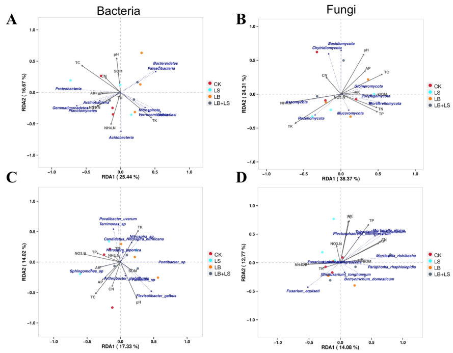 對(duì)于門(mén)水平的真菌,總?cè)郝浣M成與以下土壤理化性質(zhì)密切相關(guān):TK、NH4-N、TC、pH和TP(圖8B)。LS土壤以RozellomycotaMortierellomycota為主,其成員與TK和TP相關(guān)性最高,LB處理的土壤以Mortierellomycota、ZoopagomycotaMucoromycota為主,與 TP、TN和SOM相關(guān)性最高,以及LB + LS土壤以BasidiomycotaChytridiomycota為主,它們與土壤pH和C/N有關(guān)。