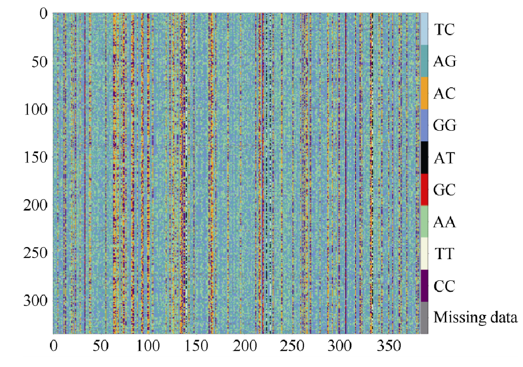篩選適宜的核心標(biāo)記位點(diǎn),并將其用合適的形式展現(xiàn)出來至關(guān)重要。利用篩選得到的SNP標(biāo)記進(jìn)行品種材料的鑒定,并構(gòu)建DNA指紋圖譜。例如,玉米DNA指紋圖譜構(gòu)建研究中,利用384個(gè)?SNP?標(biāo)記組合構(gòu)建了?335?個(gè)玉米雜交種的基因型指紋圖譜,?該圖顯示每個(gè)品種的基因型組合均不同,?即?384?個(gè)?SNP?位點(diǎn)能夠有效區(qū)分所測試的雜交種。