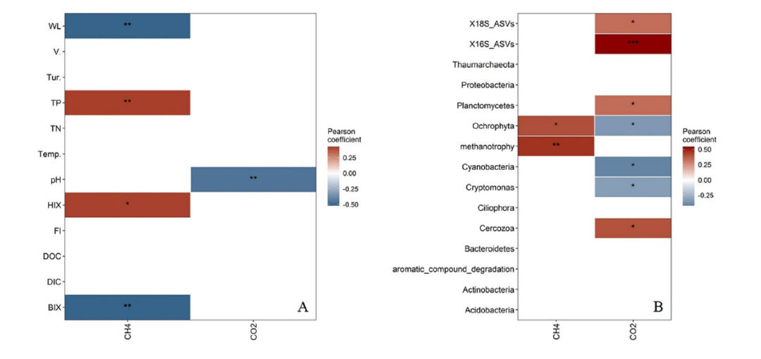 圖3生理化學變量和微生物與TGR中CO2和CH4通量之間的相關(guān)性,A組和B組分別為生理化學變量和微生物