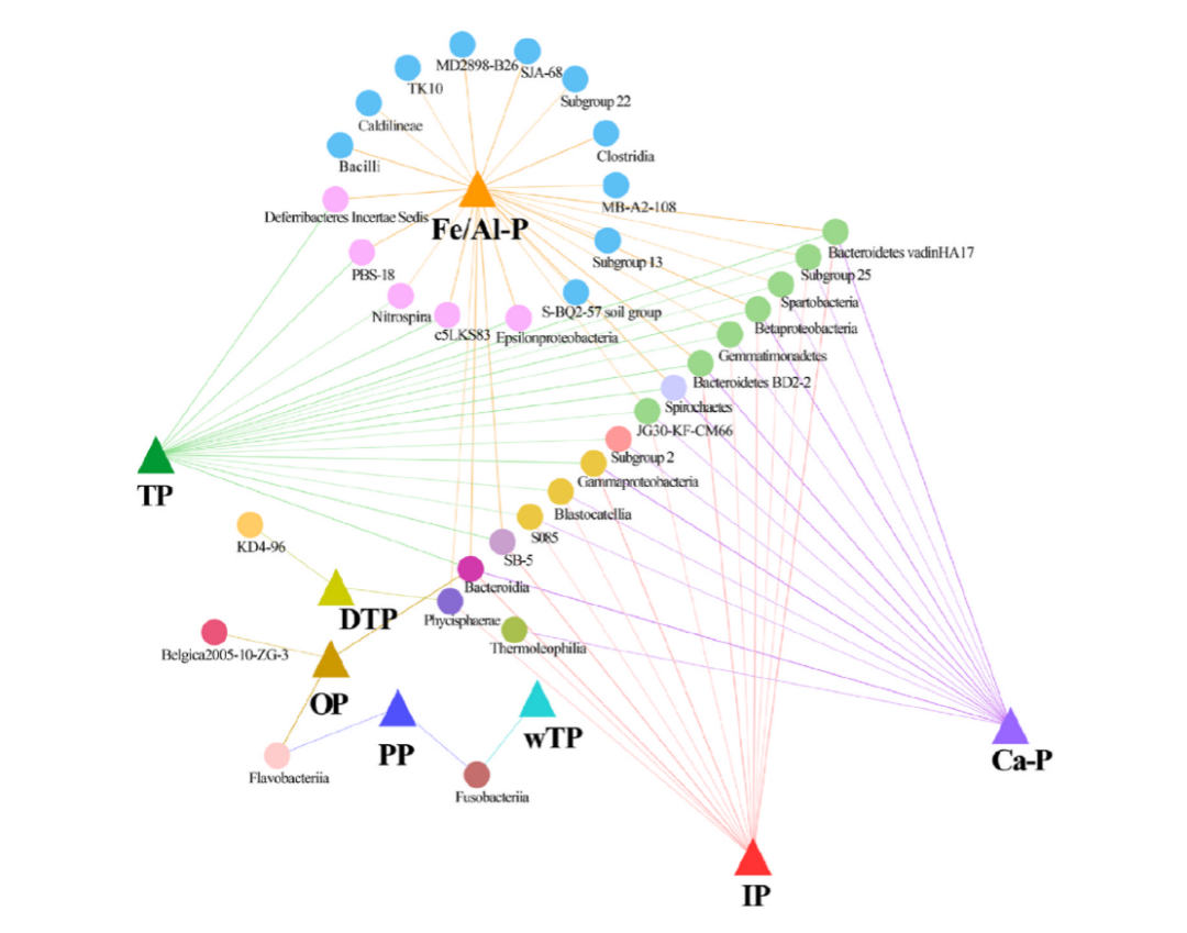 圖4?網(wǎng)絡(luò)分析顯示35個細菌群落在級別上(用圓圈表示)和8個不同的磷形式(用三角形表示)之間有很強的相關(guān)性