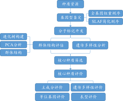 核心種質(zhì)可以最大限度地去除原始種質(zhì)資源中的重復(fù),以最少的種質(zhì)材料代表原始種質(zhì)資源的全部或大多數(shù)遺傳多樣性和地理來源,為當(dāng)前越來越多的種質(zhì)資源收集、評價(jià)和利用帶來了便利,特別是隨著基因組學(xué)的發(fā)展,測序成本的極速下降,使得大規(guī)模群體測序得以實(shí)現(xiàn)。利用高分辨率的分子標(biāo)記,提升遺傳材料間遺傳相似度和雜合度的鑒別能力,從而選擇能夠代表整個(gè)種質(zhì)資源基因多樣性的大小合理的核心種質(zhì)材料,更加有助于種質(zhì)資源的保存、管理、使用。使得我們可以有重點(diǎn)地進(jìn)行優(yōu)異種質(zhì)的研究,結(jié)合GWAS分析、遺傳進(jìn)化分析、QTL定位、特有標(biāo)記開發(fā)等方法進(jìn)一步進(jìn)行基因的挖掘與克隆,提高種質(zhì)資源的利用效率。
