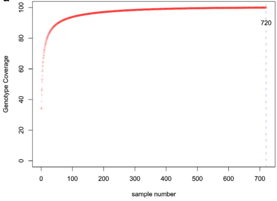 1984年,F(xiàn)rankel等人首次提出了核心種質(zhì)(core?collection)的概念。近幾十年來,核心種質(zhì)發(fā)展迅速,已在多種植物上建立核心種質(zhì),特別是近幾年分子標(biāo)記和測序技術(shù)的廣泛應(yīng)用使得基于高密度SNP標(biāo)記構(gòu)建核心種質(zhì)成為可能,對種質(zhì)資源的群體結(jié)構(gòu)和遺傳多樣性研究也愈加深入。如(Girma?et?al.,?2020)等用879,407個(gè)SNP對2010份埃塞俄比亞高粱種質(zhì)資源進(jìn)行核心種質(zhì)資源鑒定,選擇了387個(gè)(種質(zhì)資源的20%)種質(zhì)作為核心種質(zhì);(Kumar?et?al.,?2020)等用3,565,117個(gè)高質(zhì)量SNP對3004份水稻進(jìn)行核心種質(zhì)鑒定,得到一個(gè)包含520個(gè)種質(zhì)的微核心種質(zhì),結(jié)果表明其代表了原有樣品的所有表型和地理來源;(Milner?et?al.,?2019)等對22,621份庫存大麥種質(zhì)資源基因組多樣性進(jìn)行研究,共選出1000份作為其核心種質(zhì)集。除此之外,還有芝麻、小麥、棉花、甘薯、葡萄、杏、黃瓜、茄子、杉木、馬尾松等多種植物成功構(gòu)建了核心種質(zhì)資源庫。