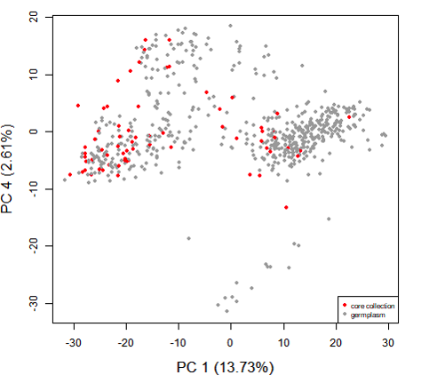 核心種質(zhì)資源(core?collection),即保存的種質(zhì)資源的一個(gè)核心子集,是采用一定方法,從保存的某一物種種質(zhì)資源中抽取的一個(gè)核心子集,以最少的遺傳資源樣本量最大限度地代表包括地理分布在內(nèi)的整個(gè)資源群體的遺傳多樣性,而未列入核心種質(zhì)的其它資源材料則作為保留樣本予以保存。因此核心種質(zhì)可以作為種質(zhì)資源群體研究和利用的切入點(diǎn),從而提高整個(gè)種質(zhì)庫的管理和利用水平。