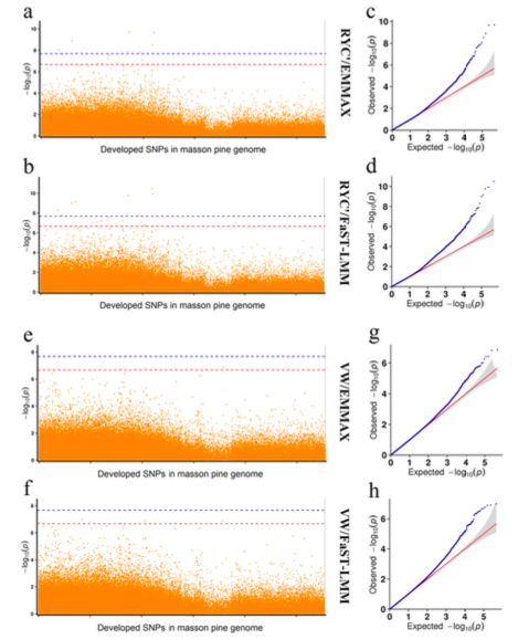 主要內(nèi)容:在本研究中,采用SLAF-seq技術(shù)對從中國廣東收集的149份馬尾松(Pinus?massoniana)材料進(jìn)行測序,從599,164個(gè)多態(tài)性SLAF標(biāo)簽中鑒定了471,660個(gè)SNP標(biāo)記。群體結(jié)構(gòu)分析表明,149份馬尾松不能劃分成明顯的亞種群。使用遺傳距離和種群結(jié)構(gòu)來選擇核心種質(zhì),篩選出包含29個(gè)材料的核心種質(zhì),分別與樹脂產(chǎn)量和木材體積相關(guān)。對122份馬尾松材料進(jìn)行關(guān)聯(lián)分析,包括不同高度(HT)、胸徑(DBH)、樹脂質(zhì)量(RW)、木材體積(VW)和樹脂產(chǎn)率(RYC),使用mrMLM、FASTmrMLM、FASTmrEMMA和ISIS?EM-BLASSO檢測到大量的SNP與性狀HT、DBH、RW和RYC顯著相關(guān)。馬尾松核心種質(zhì)為未來的改良育種提供寶貴的資源。