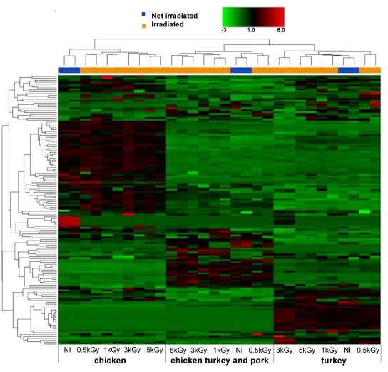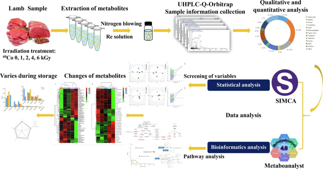輻照是一種高效滅菌方法,對肉類保存具有重要作用。本研究基于定性非靶向?HPLC-Orbitrap?代謝組學方法,旨在估計輻照雞肉、火雞和混合(雞肉、火雞和豬肉)絞肉的全局代謝組譜變化,以評估可能存在的食品安全關(guān)于代謝組改變的問題。通過LC-MS共鑒定了?402?種代謝物,并且所有三種基質(zhì)都表現(xiàn)出特定的代謝組譜,該譜組不受應(yīng)用五種不同輻照強度水平的顯著影響。特別是,所有三個肉類類別都顯示出以下共同特征: