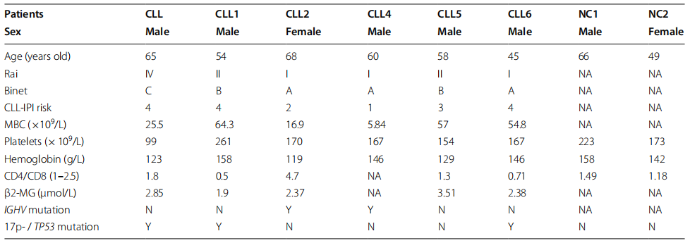 材料:6名CLL患者和2名健康人的血液樣本,臨床信息如下