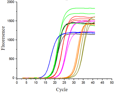 圖3:物種多樣性檢測(cè):分別以不同物種、不同濃度的RNA為模板,進(jìn)行一步法RT-qPCR擴(kuò)增。包括人肝癌(藍(lán)色);果蠅(綠色);小鼠腸道(黑色);番茄果(紅色);日本水稻(紫色);辣椒(橙色);石斑魚(yú)(灰色)。