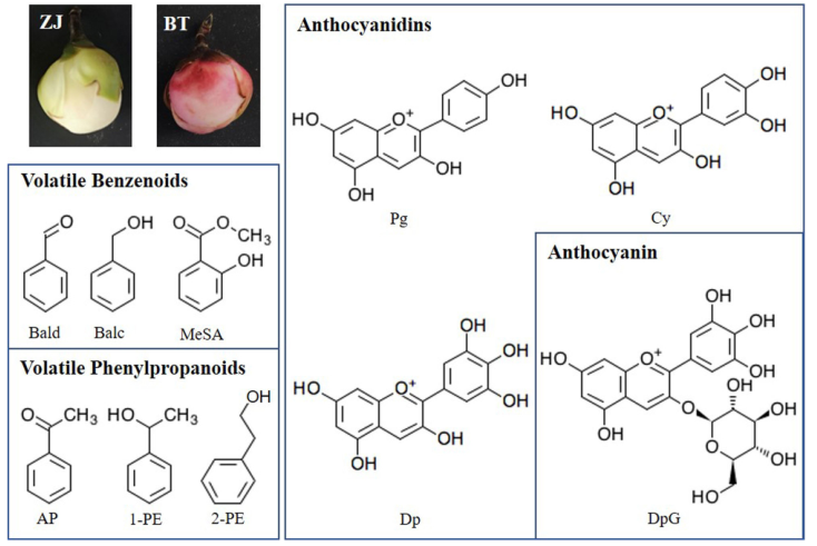 在這項(xiàng)研究中,為了研究揮發(fā)性和非揮發(fā)性BPs對紫色茶花的氣味和顏色的作用,在白色(ZJ品種)和紫色(BT品種)茶花瓣中測定了BP型香氣和花青素(圖1),確定了生物合成和花青素運(yùn)輸相關(guān)途徑中的基因表達(dá)譜,并分析了調(diào)節(jié)ZJ和BT之間氣味和顏色變化可能的TFs。