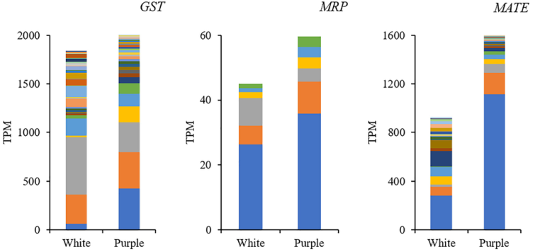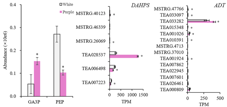 為了進(jìn)一步揭示兩個(gè)茶樹品種之間BPs的不同合成機(jī)制,檢測了上游化合物和基因(圖5)。在紫色花瓣中,3-磷酸甘油醛(GA3P)增加了2.9倍,而磷酸烯醇式丙酮酸(PEP)僅為白色花瓣的38%,這表明紫色花瓣中的碳代謝被促進(jìn),但它可能不會進(jìn)入苯丙氨酸的下游代謝。PEP的降低可能是由于高度誘導(dǎo)的3-脫氧-D-阿拉伯庚糖酸7-磷酸合成酶(DAHPS)所致。在紫色花瓣中,DAHPS基因的主要成員TEA028537的表達(dá)量高出4.6倍。芳醇脫水酶/預(yù)苯酸脫水酶(ADT)催化芳醇生成苯丙氨酸。它的主要成員TEA033282在紫色花瓣中略微升高,高出1.3倍。此外,合成的花青素在顯示顏色之前需要運(yùn)輸?shù)揭号葜?,該過程與谷胱甘肽S-轉(zhuǎn)移酶(GST)、多藥耐藥相關(guān)蛋白(MRP)以及多藥和毒素?cái)D壓(MATE)有關(guān)。把這些顯著差異基因的表達(dá)量加起來,發(fā)現(xiàn)紫色花瓣的總表達(dá)量都較高,分別高出1.1, 1. 3和1.7倍。紫色花瓣中這三個(gè)基因的主要成員(TEA015341、TEA001531和TEA006958),表達(dá)量分別高出6.9, 1. 4,和3.9倍。