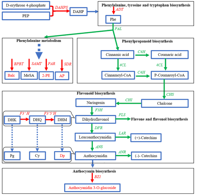 苯類化合物,尤其是苯丙烷,是植物顏色和香氣的主要來源,它們幫助植物吸引傳粉動(dòng)物或阻止外敵侵害。類苯和類苯丙烷(BPs),例如類黃酮,是一組次級代謝產(chǎn)物,來源于莽草酸途徑中的兩種芳香族氨基酸苯丙氨酸(Phe)和酪氨酸。