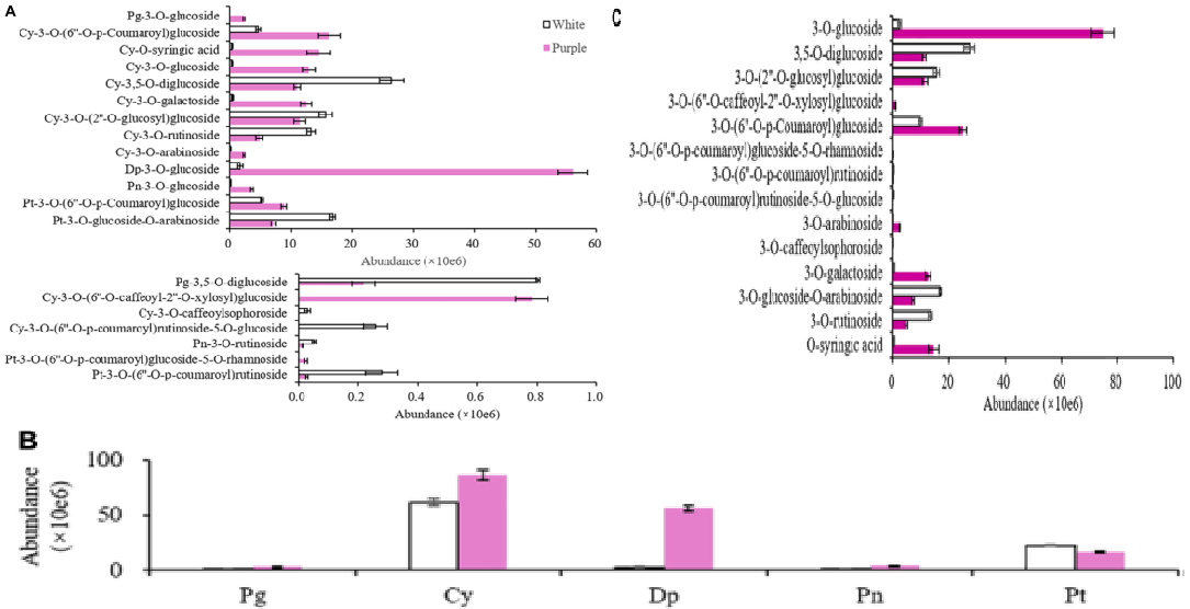Dp只有一種糖苷形式,但它在紫色花瓣中含量豐富。紫色花瓣中的主要花色苷是delphinidin-3-O-glucoside,Cy-3-O-(6’’-O-p-coumaroyl)glucoside, ?Cy-O-syringic ?acid, Cy-3-O-glucoside和Cy-3-O-galactoside,?而在白色茶花中,則是 Cy-3,5-O-diglucoside, Pt-3-O-glucoside-O-arabinoside,? Cy-3-O-(2’’-O-glucosyl)glucoside和 Cy-3-O-rutinoside 。除苷元外,這20種花青素中的另一半含有13種糖苷和1種丁香酸(圖3C)。在白色花瓣中,花青素含量高的是3,5-O-二葡萄糖苷,而在紫色花瓣中,3-O-葡萄糖苷含量極高。因此,兩個(gè)茶樹品種之間花青素的大差異是DpG,這可能是紫色花呈紫色的主要原因,以及紫色花瓣中Dp和葡萄糖的生物合成可能已增強(qiáng)。