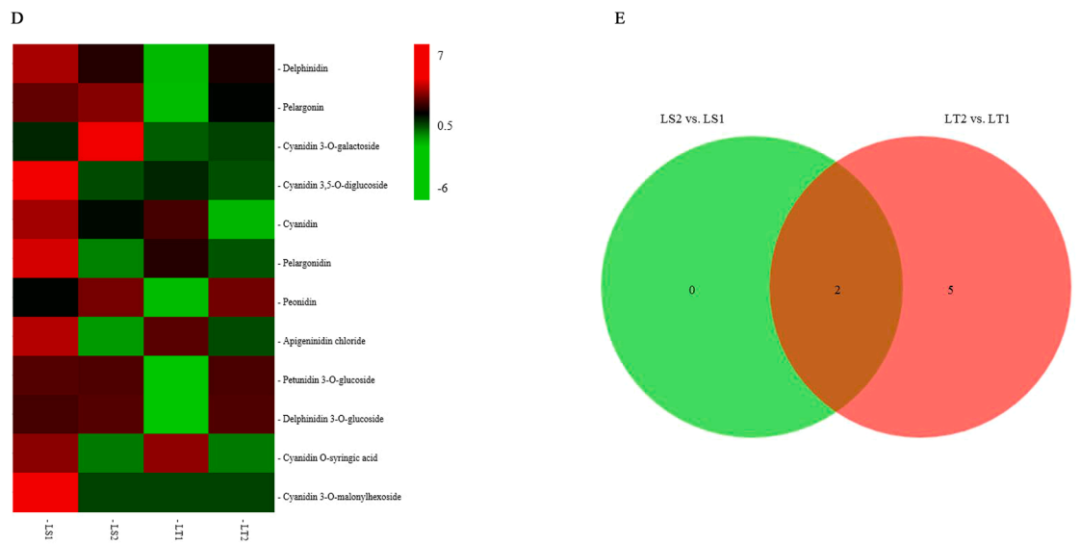 在LS1和LS2之間中共檢測(cè)到313?DAMs,LS1中有205個(gè)代謝物上調(diào)和108個(gè)代謝物下調(diào)(圖3A)。在LT1和LT2之間確定的316個(gè)DAMs中,211和105個(gè)代謝產(chǎn)物在LT1中分別上調(diào)和下調(diào)(圖3B)。LS2?vs.?LS1?中的DAMs可分為14類以上,大多數(shù)DAMs可分為五類,包括類黃酮(25.56%)、有機(jī)酸和衍生物(13.74%)、氨基酸和衍生物(12.46%)、苯丙烷類(7.99%)以及核苷酸和衍生物(7.03%)。這些黃酮類化合物可進(jìn)一步分類為37種黃酮類化合物、19種黃酮醇、9種黃酮類化合物、3種異黃酮類化合物、2種花青素、1種原花青素和9種其他黃酮類化合物。同樣,?LT2?vs.?LT1組中的DAMs也可以分為類似的類別,類黃酮(26.27%)、有機(jī)酸及其衍生物(12.03%)、氨基酸及其衍生物(11.08%)、苯丙烷類(9.81%)、脂類(9.49%)、核苷酸及其衍生物(8.54%)占很大比例。83種黃酮類化合物包括40種黃酮類化合物、18種黃酮醇、9種黃酮類化合物、7種花青素、1種原花青素、1種異黃酮和7種其他黃酮類化合物。多重比較分析表明,在“Sanbianhong”和“Tailihong”中都檢測(cè)到超過一半的DAMs(194種代謝物)(圖3C)。