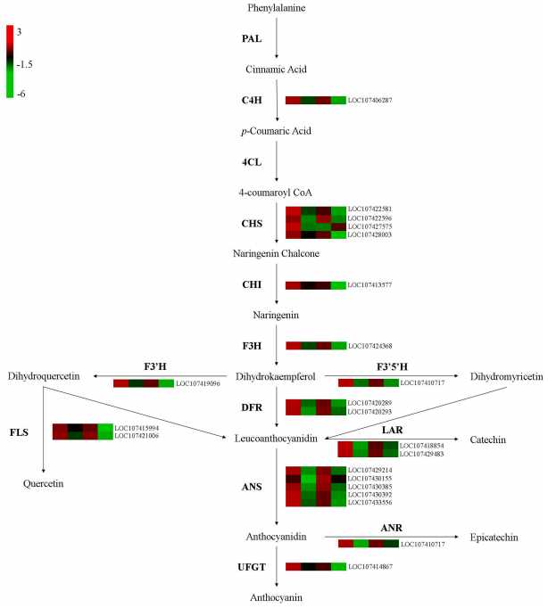 根據(jù)代謝組學(xué)分析結(jié)果,黃酮類化合物是棗葉中的主要代謝產(chǎn)物,并決定了棗葉的顏色。在“Sanbianhong”中,在LS1和LS2之間檢測(cè)到20個(gè)差異表達(dá)的類黃酮結(jié)構(gòu)基因,并且所有基因都隨著葉片發(fā)育而減少(圖5)。同樣,在成熟過程中,“Tailihong”中19個(gè)類黃酮結(jié)構(gòu)基因的表達(dá)大幅下降(圖5)。此外,“Sanbianhong”中差異表達(dá)的類黃酮結(jié)構(gòu)基因大部分與“Tailihong”中的DEGs重疊,包括一個(gè)C4H基因、兩個(gè)CHS基因、一個(gè)CHI基因、一個(gè)F3H基因、一個(gè)F3′H基因、一個(gè)F3′5′H基因、一個(gè)FLS基因、兩個(gè)DFR基因、兩個(gè)LAR基因、四個(gè)ANS基因和一個(gè)UFGT基因。