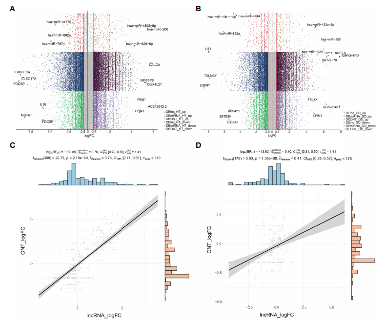 為了鑒定HT組和GD組中異常表達(dá)的lncRNA和miRNA,分別進(jìn)行了ONT全長(zhǎng)轉(zhuǎn)錄組測(cè)序和全轉(zhuǎn)錄組測(cè)序數(shù)據(jù)。差異表達(dá)分析結(jié)果顯示,共檢測(cè)到6,153?個(gè)?lncRNA?s和?741?個(gè)?miRNAs?在?HT?患者中存在差異表達(dá)(圖?1A);GD患者中檢測(cè)到5,492個(gè)lncRNAs?和?165?個(gè)?miRNAs?存在差異表達(dá)(圖?1B);相關(guān)性分析結(jié)果驗(yàn)證了本研究中兩種測(cè)序方法的檢測(cè)穩(wěn)定性(圖?1C,?D)。