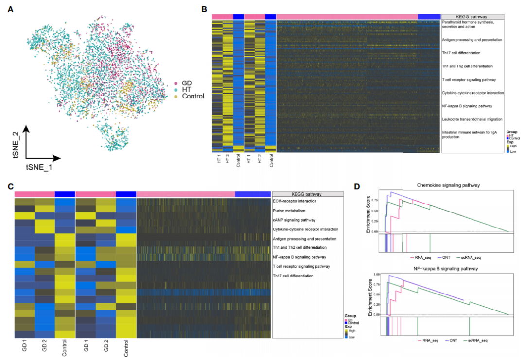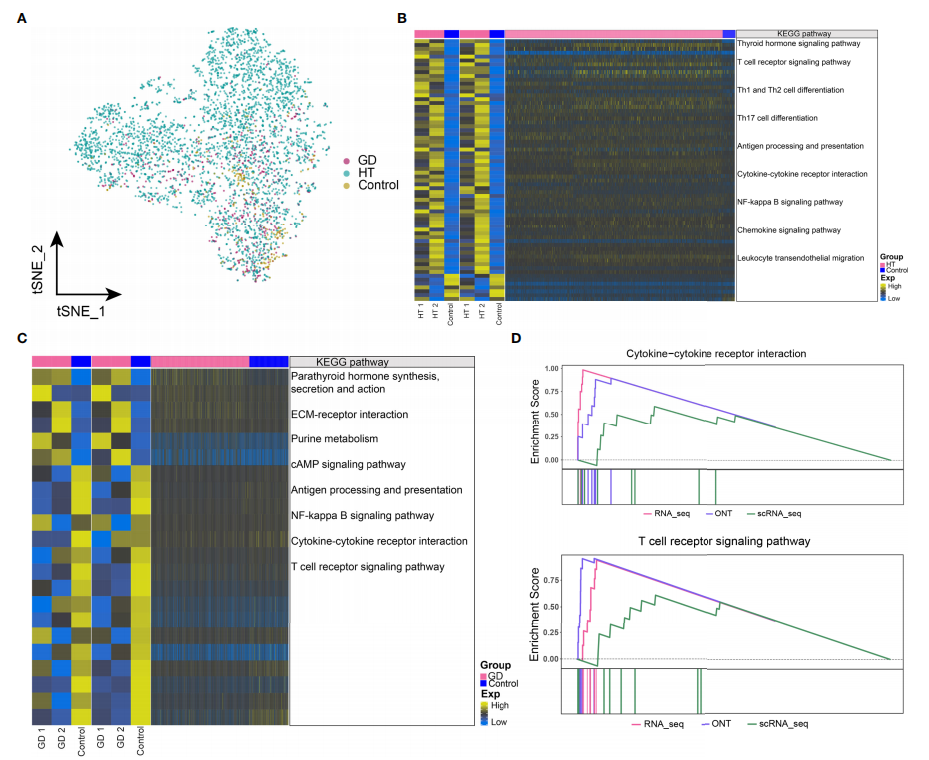 對(duì)單細(xì)胞轉(zhuǎn)錄組數(shù)據(jù)中的CD4+?T細(xì)胞亞群進(jìn)行進(jìn)一步分析,發(fā)現(xiàn)在HT、GD和對(duì)照組中細(xì)胞豐度存在明顯差異(圖?3A)。將bulk?RNA-seq數(shù)據(jù)中顯著差異表達(dá)的基因,與CD4+??T細(xì)胞的單細(xì)胞RNA-seq數(shù)據(jù)中的基因取交集,并對(duì)這些共表達(dá)的基因集進(jìn)行功能富集分析;分析結(jié)果顯示,HT組中顯著差異富集的通路有甲狀腺激素信號(hào)通路、T?細(xì)胞受體信號(hào)通路、Th1和Th2細(xì)胞分化、Th17細(xì)胞分化、細(xì)胞因子-細(xì)胞因子受體相互作用和NF-kappa?B信號(hào)通路(圖?3B);而在GD組中,甲狀旁腺激素合成,分泌和作用、ECM-受體相互作用、嘌呤代謝、cAMP?信號(hào)通路、NF-kappa?B?信號(hào)通路、細(xì)胞因子-細(xì)胞因子受體相互作用和T細(xì)胞受體信號(hào)通路顯著富集(圖?3C?)。GSEA富集分析結(jié)果顯示,HT組中細(xì)胞因子-細(xì)胞因子受體相互作用和T細(xì)胞受體信號(hào)通路顯著富集(圖?3D),但GD組中未觀察到顯著富集的通路。此外,氨基酸生物合成和嘌呤代謝相關(guān)的代謝通路在HT和GD組中均顯著富集。