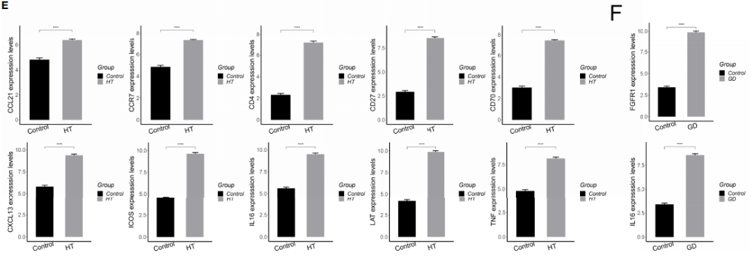 鑒于免疫反應(yīng)在HT和GD中的重要作用,利用GSEA方法進(jìn)行免疫浸潤(rùn)分析,進(jìn)一步評(píng)估了樣本中免疫細(xì)胞的豐度,發(fā)現(xiàn)CD4?+T細(xì)胞、CD8?+?T細(xì)胞、巨噬細(xì)胞、Th1和Th2細(xì)胞均有不同程度的浸潤(rùn)(圖?2H)。