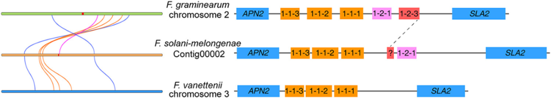 其他三種密切相關(guān)的 FSSC 物種F. falciforme、F. solaniF. vanettenii的基因組被用作參考基因組來探索 CRI 24-3 的選擇壓力。分別確定了 CRI 24-3 與?F. falciforme、F. solani?F. vanettenii?之間的 2265、2272 和 2272 直系同源物對的非同義替換率 (Ka) 與同義替換率 (Ks) 的比率( 圖 6C 至 E)。Ka /Ks總體分析的值小于 1,表明 CRI 24-3 中的大多數(shù)直系同源物似乎都經(jīng)過了純化選擇并且高度保守。然而,CRI 24-3 和F. falciforme基因組的比較確定了一個快速進化基因?qū)Γ‥VM0014458.1 與 GE10416_g)的 Ka /Ks比率大于 1,表明陽性選擇可能發(fā)生在進化。基因組共線性分析表明,F. vanetteniiF. oxysporum基因組中的幾個染色體片段在 CRI 24-3 中濃縮成一個片段,并有一些倒位(圖 6F )。此外,CRI 24-3 中的一些直系同源物具有多對一的關(guān)系。CRI 24-3 中至少有兩個查詢基因與參考物種中的相同直系同源物匹配。值得注意的是,CRI 24-3 的重要基因組區(qū)域不能與尖孢鐮刀菌基因組中的那些共線性耦合,由 35.9% 的共線性率(共線直系同源物對與所有直系同源物對的比率)支持,該比率低于CRI 24-3 和F. vanettenii?(77.6%)。結(jié)果表明,CRI 24-3在系統(tǒng)發(fā)育上與尖孢鐮刀菌相距較遠。MAT基因座對于在鐮刀菌屬中產(chǎn)生子囊孢子至關(guān)重要。在此,交配型結(jié)構(gòu)組織 ( MAT ) 基因座在基于簡化的共線性分析比較了茄科鐮孢菌CRI 24-3、禾谷鐮刀菌PH-1 和F. vanettenii?77-13-4(圖 7)。與僅攜帶 MAT1-1 基因的?F. vanettenii?77-13-4相比, CRI 24-3 含有MAT1-1和MAT1-2獨特型基因,在單個MAT基因座處與禾谷鐮刀菌密切相關(guān),除了 CRI 24-3 是 MAT1-2-3 缺陷型。只有位于 CRI 24-3 中 MAT1-2-1 上游區(qū)域的沒有任何特征功能域的片段與禾谷鐮刀菌中的 MAT1-2-3 具有序列相似性。
