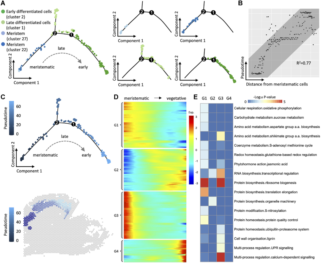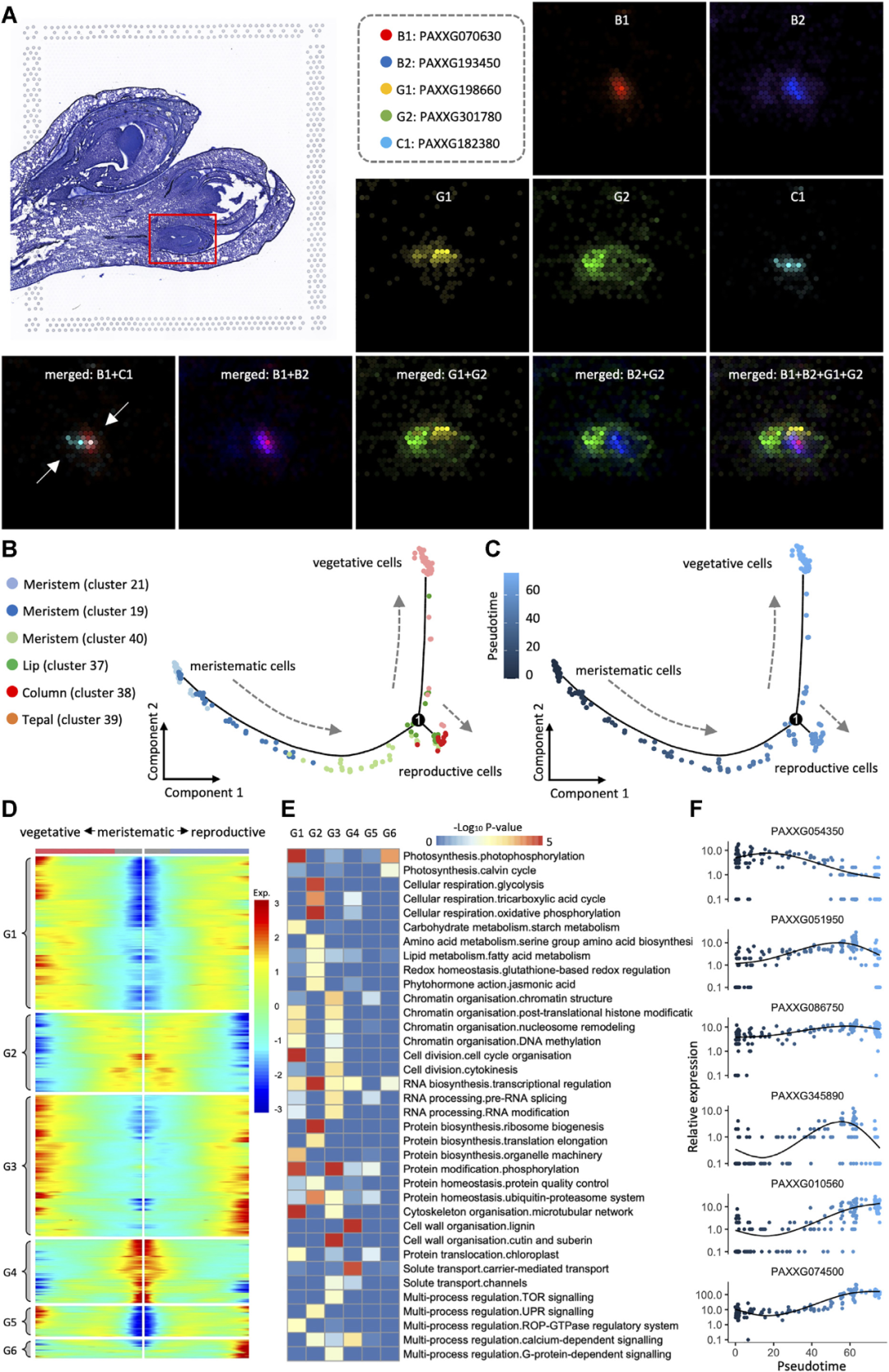 為了研究從分生組織細(xì)胞到營養(yǎng)型細(xì)胞(花被、唇瓣)和生殖細(xì)胞(花柱)的分化,研究團(tuán)隊(duì)用Monocle繪制了細(xì)胞狀態(tài)的軌跡。如圖2B所示,三簇分生組織細(xì)胞形成了一條連續(xù)的路徑,代表其發(fā)育過程,與其在組織學(xué)切片上的位置高度一致。該路徑分為兩條子路徑:一條是由花被片中的營養(yǎng)型細(xì)胞組成,另一條由花柱中的花藥原基生殖細(xì)胞組成。細(xì)胞類型變化的軌跡作為動(dòng)態(tài)發(fā)育過程的靜態(tài)投影,也可以理解為分生組織細(xì)胞的擬時(shí)序分化。如圖2C所示,此時(shí)營養(yǎng)型細(xì)胞出現(xiàn)較早,并分散在子路徑的遠(yuǎn)端。共鑒定出4,685個(gè)空間差異基因與發(fā)育擬時(shí)間相關(guān),對這些基因繪制分支軌跡基因表達(dá)熱圖,發(fā)現(xiàn)它們隨著發(fā)育路徑的分離表現(xiàn)出不同的表達(dá)模式(圖2D)。MapMan功能富集圖顯示它們主要富集在細(xì)胞壁代謝、激素、脂質(zhì)、蛋白質(zhì)和RNA合成等功能上(圖2E)。通過基因的擬時(shí)分布圖發(fā)現(xiàn)許多其他基因可能在分生組織、營養(yǎng)組織和生殖組織的細(xì)胞分化過程中發(fā)揮作用(圖2F)。