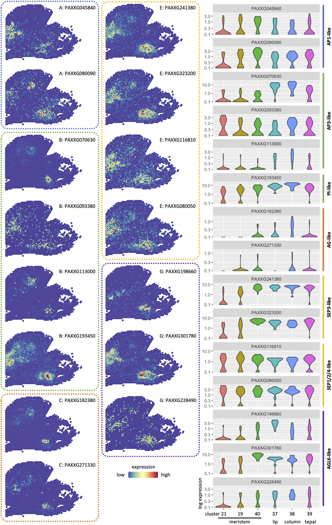 為了發(fā)現(xiàn)蘭花中特異的ABC code,本研究對7種被子植物的MADS-box基因進(jìn)行了系統(tǒng)發(fā)育分析。在蝴蝶蘭中的21個(gè)ABCDEG類MADS-box基因中,有15個(gè)基因在空間轉(zhuǎn)錄組數(shù)據(jù)集上檢測到表達(dá)信號(hào),且在不同組織部位呈現(xiàn)出優(yōu)先或特異的表達(dá)模式(圖3)。其中,AP3-like和PI-like基因(B類基因)均在花被片、唇瓣和花柱的原基中表達(dá)。特別是PAXXG070630在花柱頂端組織周圍表現(xiàn)出梯度表達(dá)信號(hào),其中單個(gè)spot點(diǎn)表達(dá)量高,其周圍細(xì)胞的表達(dá)信號(hào)隨著離中心spot點(diǎn)的距離增大而減弱,表明花藥在發(fā)育的這一階段是從單個(gè)spot點(diǎn)開始的。AG-like(C類基因)的空間表達(dá)譜上也存在類似的情況,為花藥的器官發(fā)生提供了進(jìn)一步的證據(jù)。而AP1-like基因(A類基因)優(yōu)先表達(dá)于分生組織中或廣泛表達(dá)于各器官中,AGL6-like(G類基因)則在唇瓣和花被片中特異表達(dá)。