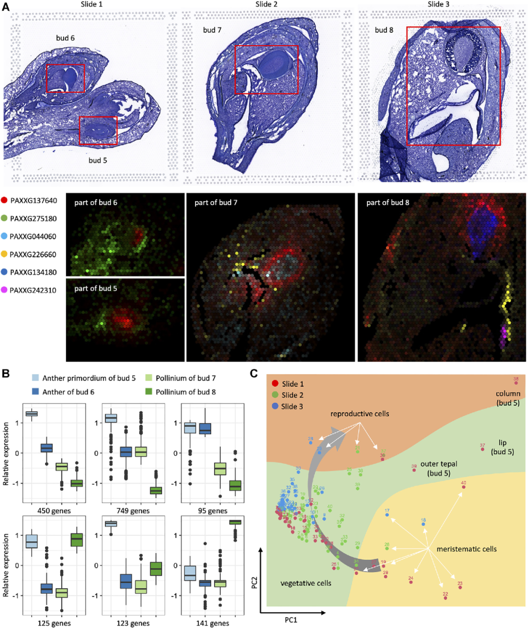 與花被、唇瓣這類營養(yǎng)組織不同,花藥的發(fā)育起始時(shí)間更晚,過程也更為復(fù)雜?;ㄋ幤鹗加诨ㄖ敹说幕ㄋ幵?,如圖2A所示,spot點(diǎn)中B-和C-功能基因表達(dá)呈現(xiàn)高表達(dá)。與此同時(shí),許多下游基因被激活,用于進(jìn)一步的形態(tài)建成過程。例如,在6號(hào)花苞的花藥中心出現(xiàn)花粉塊,之后在7號(hào)和8號(hào)花苞中可以觀察到它的形狀變化過程(圖5A)。為了進(jìn)一步探究花藥發(fā)育過程中基因表達(dá)的動(dòng)態(tài)變化,收集了花藥原基或花粉上優(yōu)先表達(dá)的1,683個(gè)基因進(jìn)行比較,發(fā)現(xiàn)不同花苞之間存在不同的表達(dá)模式。正如如圖5B所示,在5號(hào)花苞和8號(hào)花苞中分別有123和141個(gè)基因高表達(dá)。而其中大部分基因呈現(xiàn)從5號(hào)花苞到8號(hào)花苞整體減少的表達(dá)模式。展示了與蘭花生殖相關(guān)營養(yǎng)型細(xì)胞中特異表達(dá)或優(yōu)先表達(dá)的一系列關(guān)鍵基因,顯示了花藥發(fā)育過程中表達(dá)譜的動(dòng)態(tài)變化。通過對三個(gè)樣本的120個(gè)clusters進(jìn)行PCA分析,表明花藥的早期營養(yǎng)組織,雖然存在相似的基因表達(dá)模式,沒有表現(xiàn)出特異表達(dá)的基因,但在發(fā)育后期迅速經(jīng)歷了分化和形態(tài)建成過程(圖5C)。