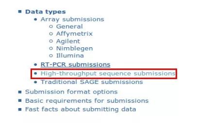 GEO數據庫支持上傳芯片數據、高通量數據以及RT-PCR數據等,首先選擇需要上傳數據的類型,接下來以high-throughput sequence submisssions (高通量測序)為例進行詳解。