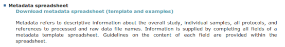 可以看見我們上傳數據需要準備三個文件,分別為:Metadata spreadsheet、Processed data files、Raw data files。下面分別介紹每個文件如何填寫以及準備。