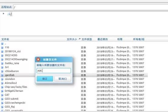 連接成功后,在遠程站點下的文件名展示中創(chuàng)建自己的文件,在fasp目錄下面創(chuàng)建自己的目錄(當然也可以與fasp目錄同級下創(chuàng)建),例如ABC,創(chuàng)建方法為點擊鼠標右鍵,會出現(xiàn)下圖中的創(chuàng)建空文件夾對話框,輸入自己文件夾的命名,之后點擊確認,這樣你的文件夾就創(chuàng)建成功了。
