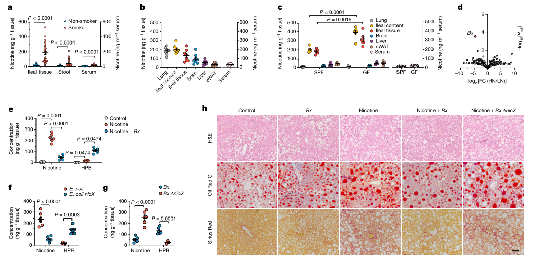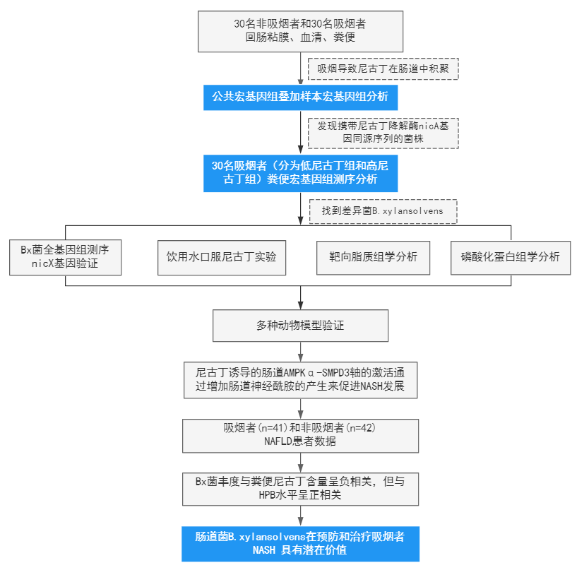 該研究發(fā)現(xiàn)尼古丁在吸煙期間在腸道中積聚并加速NAFLD的進(jìn)展,但它可以被人類共生菌B. xylanisolvens 有效降解。揭示了了腸道尼古丁積累的病理影響,并確定了一種內(nèi)源性尼古丁降解腸道細(xì)菌,該細(xì)菌對(duì)預(yù)防和治療吸煙者的 NASH 具有潛在價(jià)值。