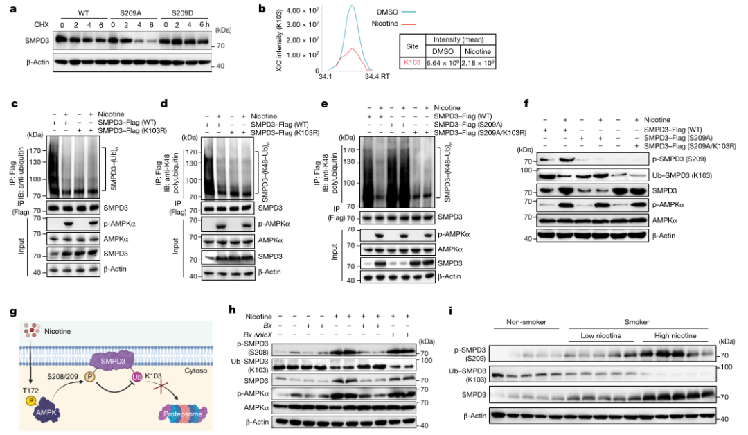 此外,在尼古丁處理的SW480細(xì)胞中,SMPD3在Lys103處的去泛素化程度顯著高于DMSO處理的細(xì)胞(圖3B和擴(kuò)展數(shù)據(jù)圖6G)。通過(guò)免疫沉淀,我們發(fā)現(xiàn)泛素化的SMPD3(Lys103)主要包含經(jīng)典的Lys48-連接Ub鏈(Lys48-Ub),而不是Lys63-Ub,后者被尼古丁處理減少(圖3C,d和擴(kuò)展數(shù)據(jù)圖6h)。S209A突變逆轉(zhuǎn)了尼古丁誘導(dǎo)的SMPD3 Lys48-Ub的減少,K103R突變進(jìn)一步緩解了這一下降(圖3e和擴(kuò)展數(shù)據(jù)圖6i)。此外,開(kāi)發(fā)了抗p-SPMD3(S209)和抗Ub-SMPD3(Lys103)抗體(擴(kuò)展數(shù)據(jù)圖6J,k),并證實(shí)尼古丁誘導(dǎo)的總SMPD3蛋白的增加是由于SMPD3磷酸化水平升高,隨后泛素化減少(圖3F)。