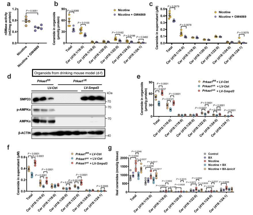 SMPD3被認(rèn)為是代謝性疾病的病理加速器。將SMPD3抑制劑GW4869應(yīng)用于有機(jī)化合物以抑制SMPD3活性。GW4869降低了尼古丁處理下類器官及其上清液中的神經(jīng)酰胺水平。慢病毒表達(dá)的SMPD3被用于從尼古丁飲用模型恢復(fù)Prkaa1基因敲除的回腸器官中SMPD3的表達(dá)。正如預(yù)期的那樣,SMPD3的過(guò)表達(dá)逆轉(zhuǎn)了由于回腸器官中AMPKα1缺乏而導(dǎo)致的神經(jīng)酰胺水平的降低。在尼古丁加速的NASH小鼠模型中,在B. xylanisolvens存在的情況下,被B.xylansolvens定植的SPF小鼠回腸神經(jīng)酰胺減少,這是由于腸道p-AMPKα-SMPD3軸被抑制所致。