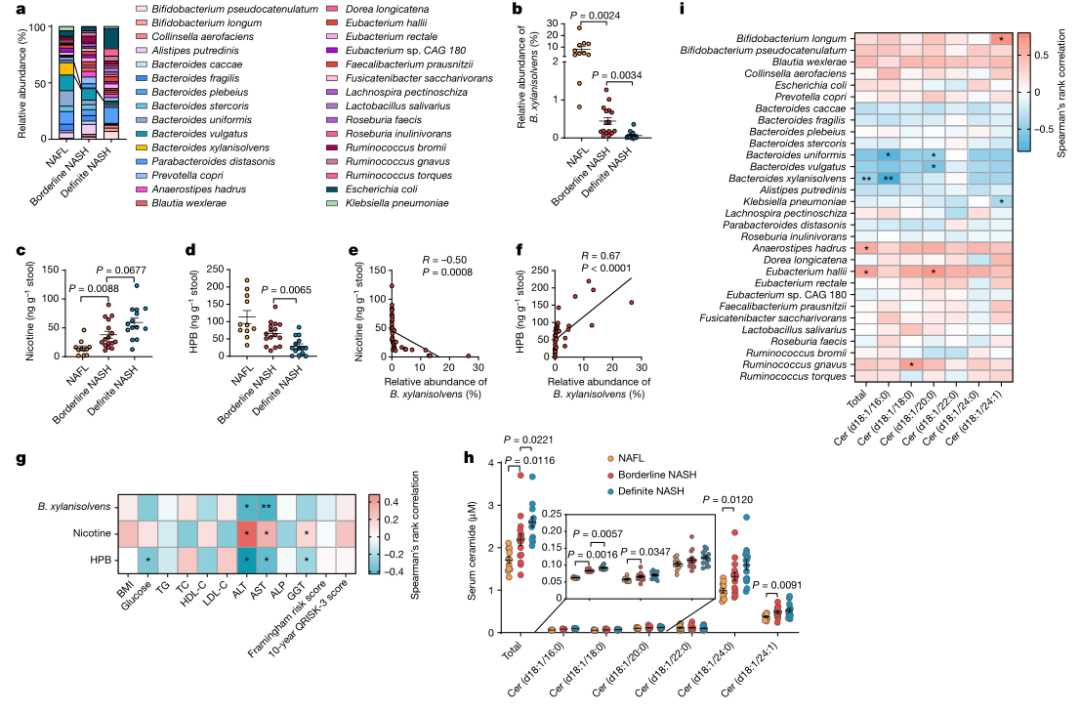 為了闡明我們的發(fā)現(xiàn)與人類NAFLD進(jìn)展之間的相關(guān)性,我們收集了83名經(jīng)活檢證實(shí)的NAFLD患者的數(shù)據(jù),這些患者被分為吸煙者(n=41)和非吸煙者(n=42)。在吸煙者中,NAFL、Borderline NASH和Defined NASH在煙草吸煙史(包括吸煙年限和每天吸煙數(shù)量)方面沒(méi)有顯著差異。然而,我們發(fā)現(xiàn)B.xylansolvens水平與NAFLD嚴(yán)重程度呈負(fù)相關(guān),隨著NAFLD的進(jìn)展,糞便中尼古丁水平逐漸增加,糞便中尼古丁降解產(chǎn)物HPB相應(yīng)地隨著NAFLD的進(jìn)展而減少(圖4C,d)。在吸煙者中,B.xylansolvens豐度與糞便尼古丁含量呈負(fù)相關(guān),但與HPB水平呈正相關(guān)(圖4e,f)。