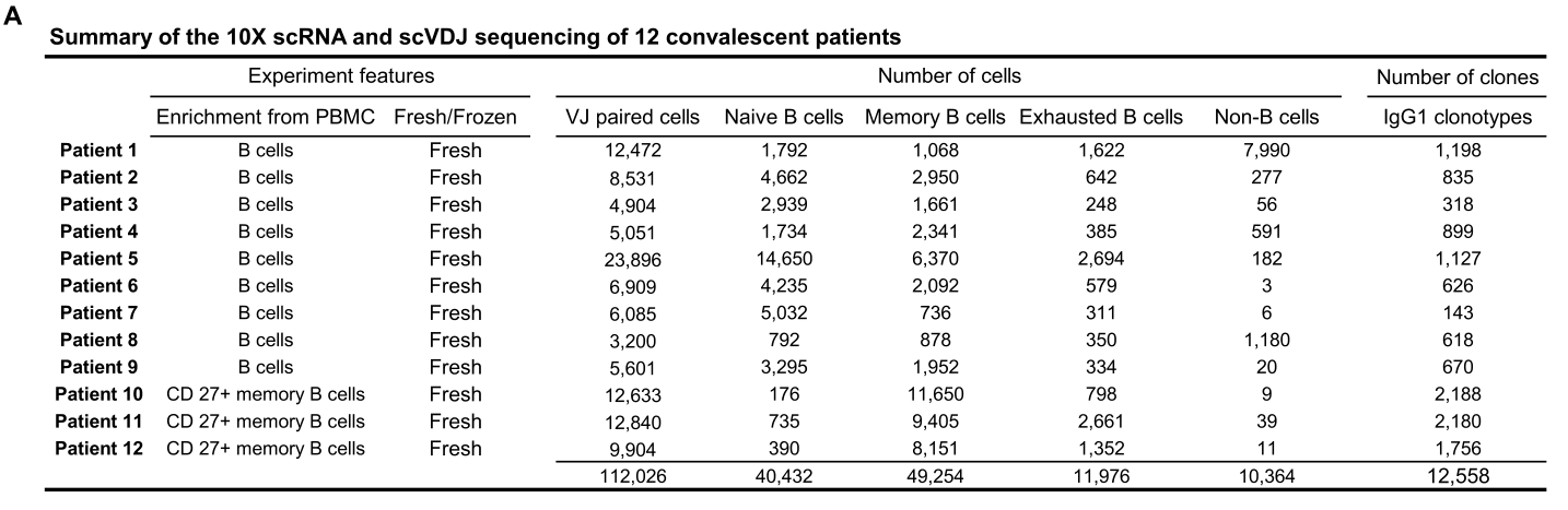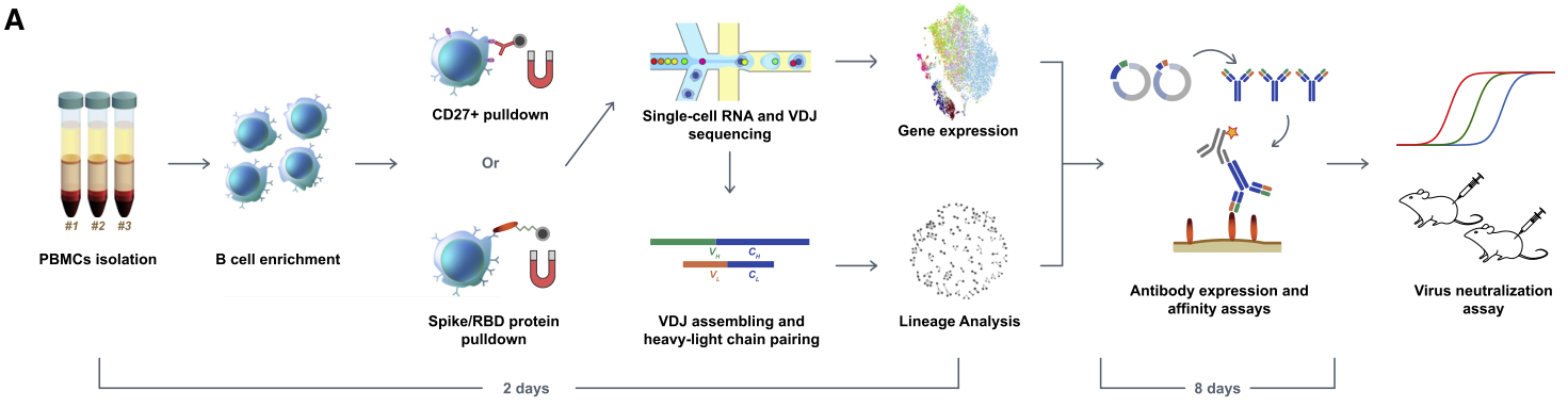 樣本設(shè)計(jì):從12個(gè)COVID-19康復(fù)患者的外周血單核細(xì)胞PBMC中分離B細(xì)胞,對(duì)B細(xì)胞和CD27+記憶B細(xì)胞進(jìn)行scRNA-seq + scBCR-seq,獲得IgG1亞型抗體,并進(jìn)行抗體體外檢測和篩選。