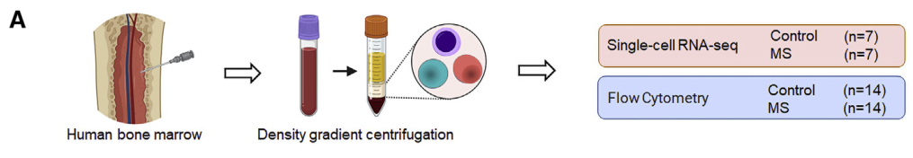 樣本設(shè)計(jì):MS患者及健康對(duì)照各7例,取骨髓樣本,進(jìn)行scRNA-seq+scTCR-seq。