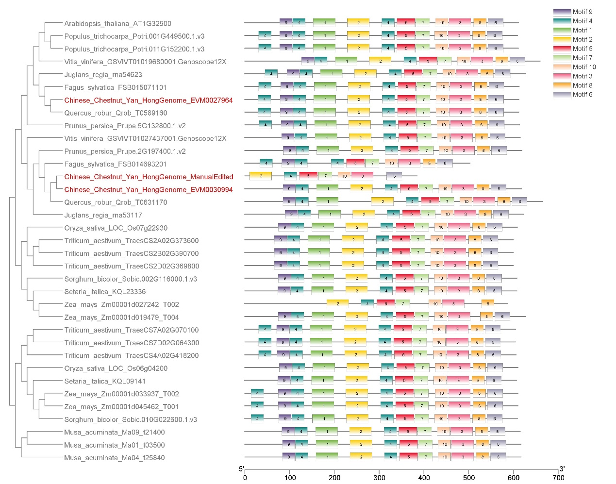 糯性是板栗最重要的食用品質之一。然而,關于板栗中糯性基因報道卻很少。通過與近緣種比對,發(fā)現板栗中與糯性相關的基因家族GBSS II存在擴張。為了進一步探索該家族進化趨勢,本研究針對所有GBSS蛋白和相關家族成員進行了系統的發(fā)育分析。研究表明板栗中的GBSS II-b分支比近源物種多個成員。