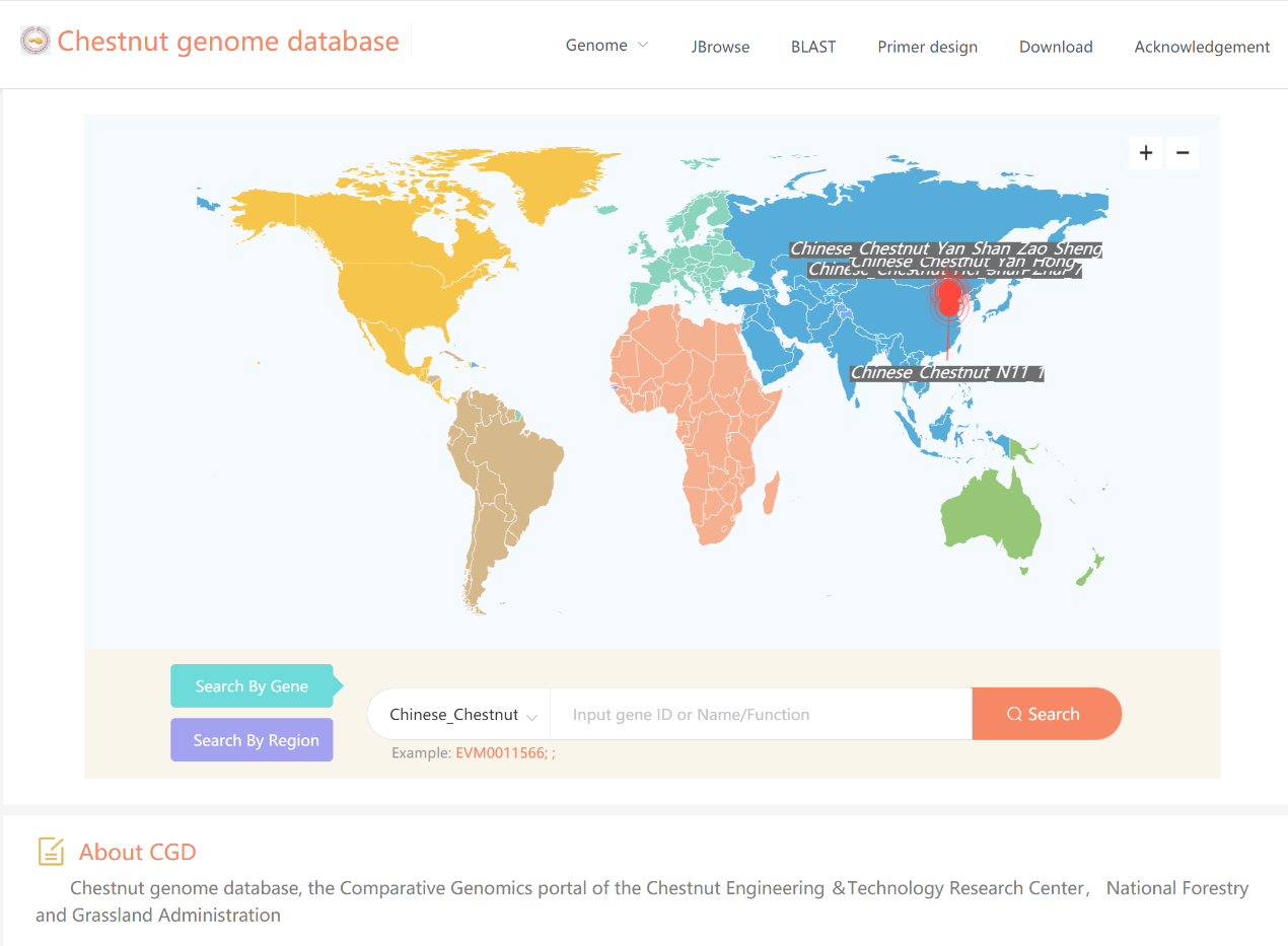此外,依托國家林草局板栗工程中心,構建了板栗基因組數據庫(圖三),為瀏覽基因組(JBrowse)、搜索序列(BLAST)和設計引物提供了工具。