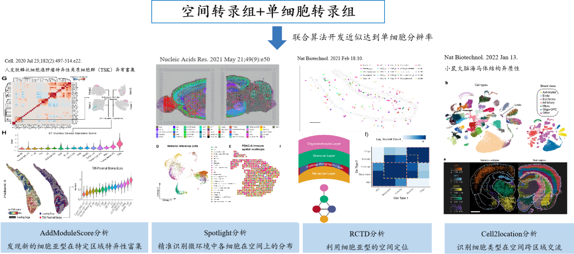 基因表達(dá)具有時(shí)間和空間特異性,單細(xì)胞轉(zhuǎn)錄組主要從時(shí)間上研究基因表達(dá),能夠系統(tǒng)的識(shí)別組織中的細(xì)胞亞群,但沒(méi)有捕獲其空間組織信息,限制了我們對(duì)組織及細(xì)胞間相互作用的理解。而空間轉(zhuǎn)錄組的應(yīng)用使得人們能夠從空間的角度解析數(shù)據(jù),在空間上研究基因的表達(dá)。通過(guò)整合兩種數(shù)據(jù)模式,將單細(xì)胞轉(zhuǎn)錄組數(shù)據(jù)和空間轉(zhuǎn)錄組數(shù)據(jù)進(jìn)行聯(lián)合分析,在時(shí)空上分析基因的表達(dá)具有重要的意義。