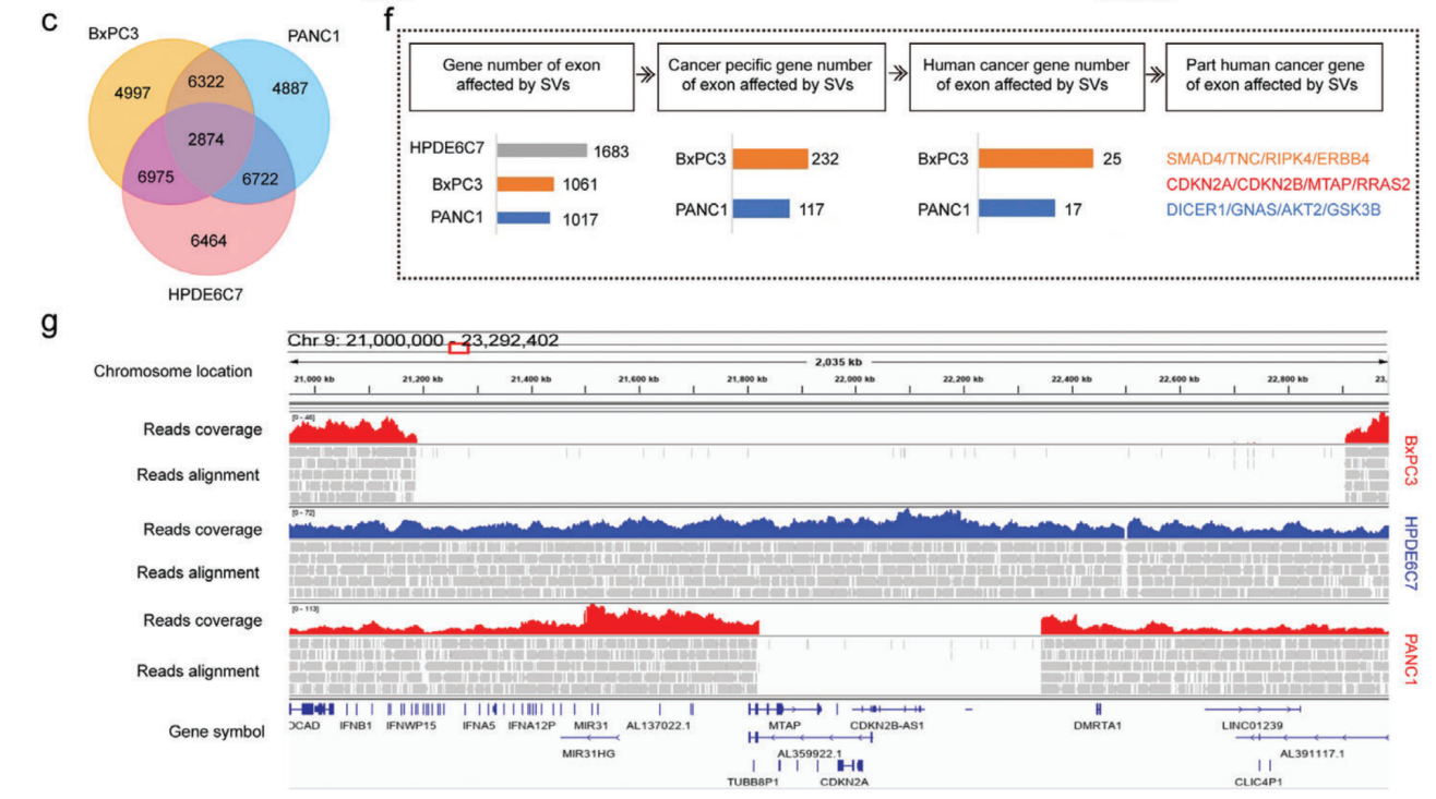 研究了在其外顯子區(qū)域受到SV直接影響的基因,并分別在PANC1、BxPC3和HPDE6C7中檢測到了1017、1061和1683個基因的變化。在PANC1中獨立檢測到14號染色體上的DICER1擴增,19號染色體上的AKT2缺失和20號染色體上的GNAS插入。在BxPC3中特異性地檢測到9號染色體上的TNC缺失,11號染色體上的RRAS2插入和18號染色體上的SMAD4缺失。BxPC3樣本中還存在許多基因大片段缺失,長度超過1.7 Mb,包括CDKN2A、CDKN2B、MTAP和DMRTA1等基因?;陂L讀長測序結(jié)果建立了人類胰腺癌中SV的特征,為全面研究SV在這種致命惡性腫瘤中的發(fā)病機制提供寶貴的資源。